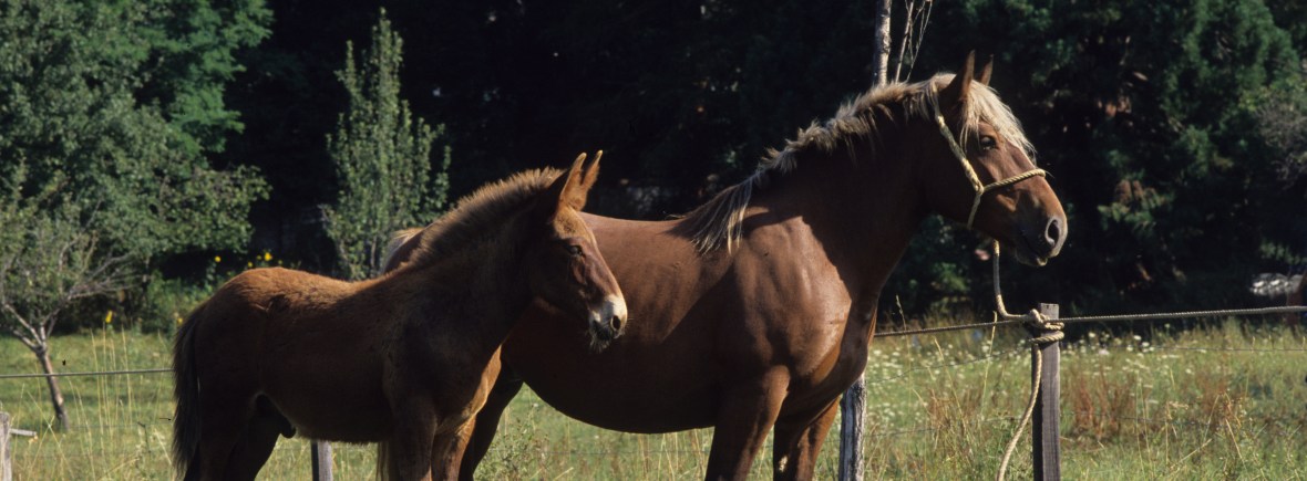 En été, les animaux de la famille du mulet (ânes et juments) pâturent dans nos parcs. Lors de démonstrations, des mules mettent en œuvre divers matériels agricoles, sylvicoles ou de transport et rappellent la vie agropastorale et aussi commerciale ou militaire des siècles passés. Elles font la démonstration de l’utilisation toujours d’actualité, de ces animaux remarquables pour les promenades en calèche, le débardage, le maraîchage ou l’aide au portage en randonnée, entre autres.